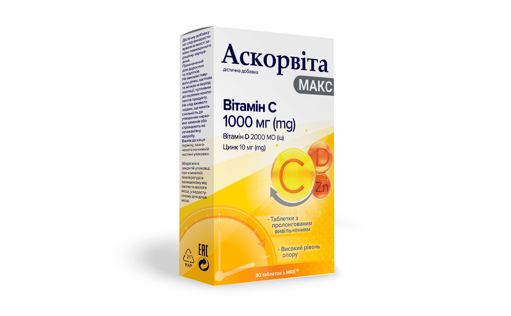 Свойства: Аскорвита Макс содержит максимально действенное количество витамина С, действие которого дополнительно поддерживается витамином D и цинком. Такой комплекс существенно повышает сопротивляемость организма к инфекциям. Продукт представлен в форме шипучих таблеток. Подходит людям, которые испытывают трудности с проглатыванием таблетки и склонны к потреблению витаминов в жидкой форме. Витамин С, витамин D и цинк способствуют правильному функционированию иммунной системы. Витамин С и цинк принимают участие в защите клеток от оксидативного стресса. Витамин D помогает поддерживать здоровье костей и нормальное функционирование мышечной системы.